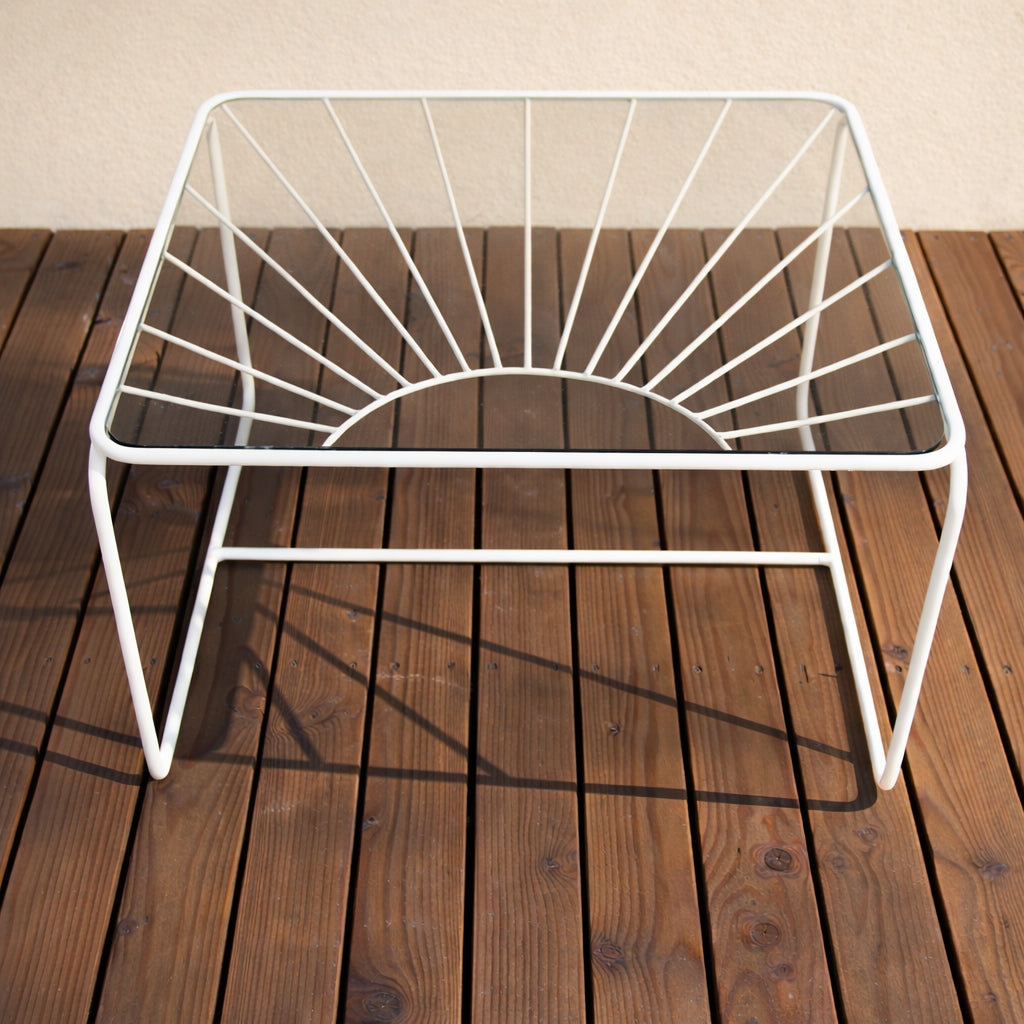 Structure en fer peinture époxy forme soleil Marron glacé et beige glacé. Plateau en verre fumé