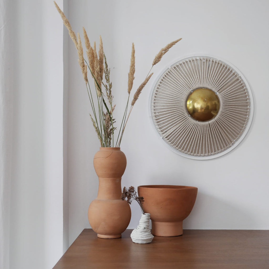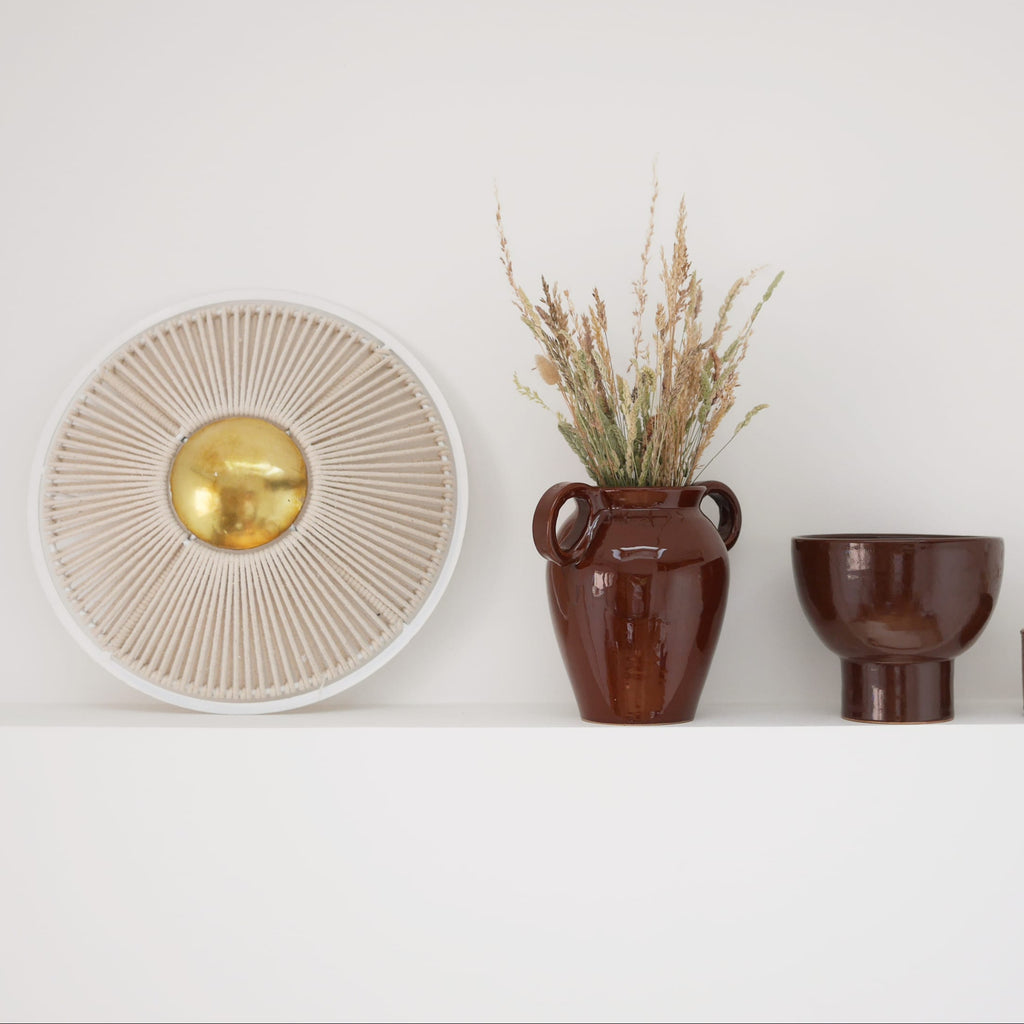 La cible du rond est dorée et la couleur de la structure peut se décliner en fer doré, fer blanc ou en fer noir. Le tressage de ces appliques est en corde ou en raphia selon le look que vous voulez lui donner. Faites votre mix & match !