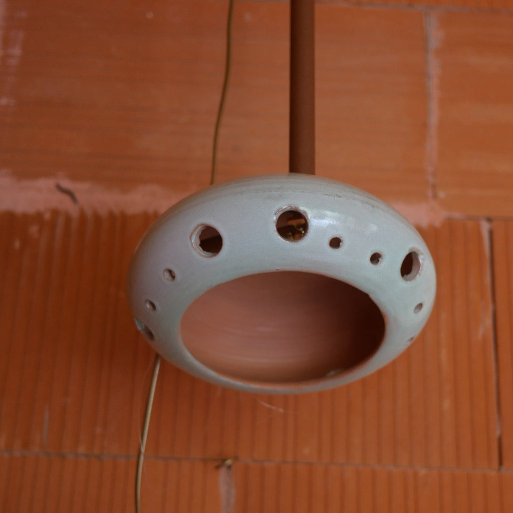 - Matière : Abat jour terre cuite émaillé et tige en fer recouverte d'une peinture époxy : Bleu givré sur céramique caramel, Brun sur céramique bleu ciel, écru sur céramique kaki