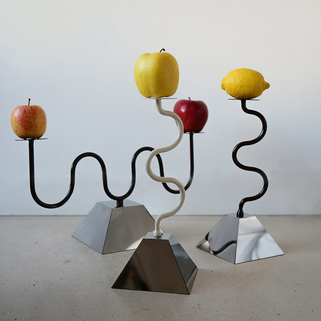 Des pièces au caractère affirmé et volontairement funky, pensées pour embellir une table entre amis ou une table basse. On peut aussi s’amuser à les détourner en support décoratif, en y posant fruits ou légumes, pour composer un décor de table vivant et inattendu, comme sur la photo.