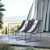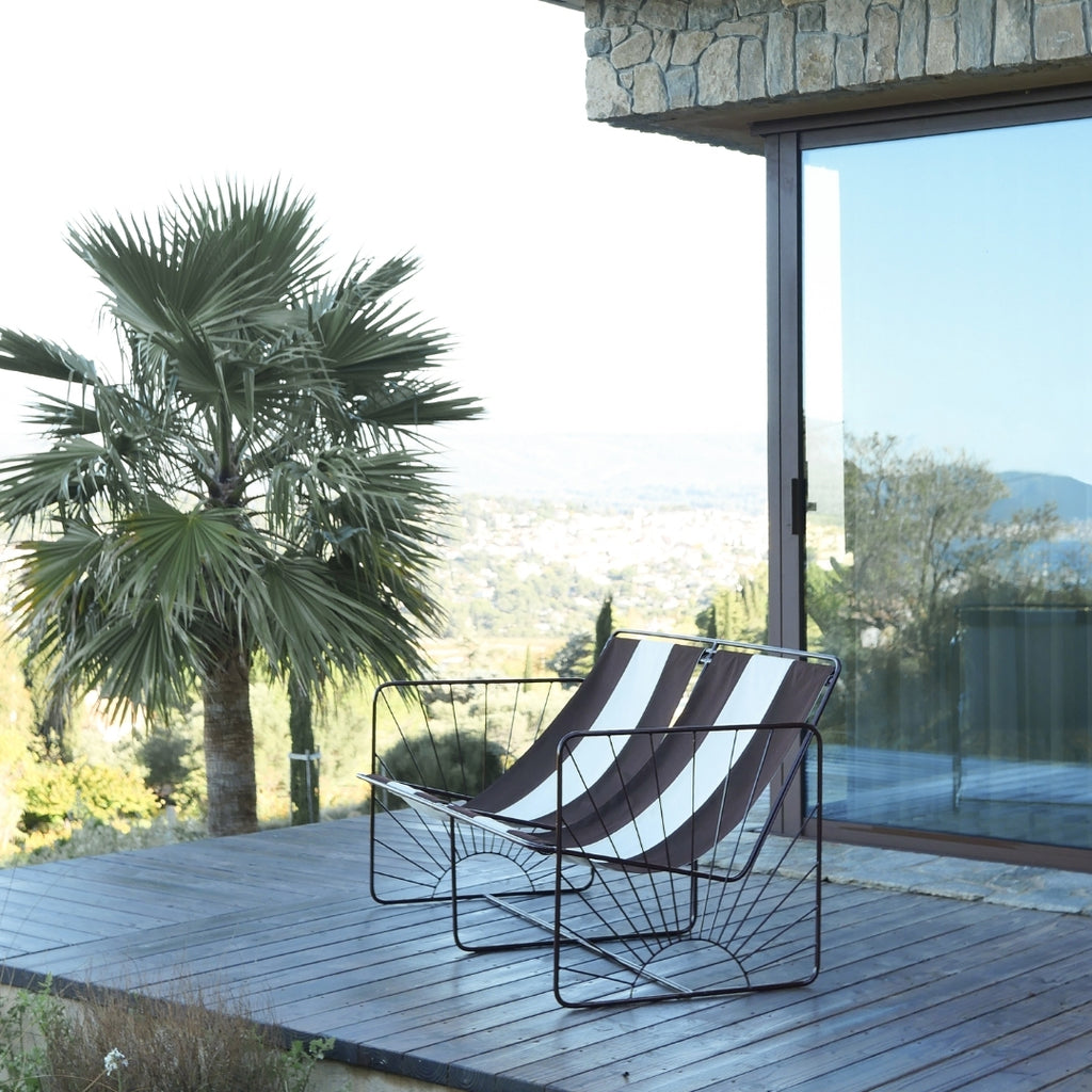 La toile est solide, déhoussable et déperlante, doublée d’une toile intérieure dont la teinte rappelle celle des rayures. Sa structure en fer, aux lignes cubiques affirmées, est proposée en beige glacé ou en marron glacé. Les accoudoirs sont ornés du motif soleil emblématique de la collection, dont les ombres projetées au sol évoluent au fil de la journée. Expressive et accueillante, la banquette Eldorado s’impose comme une pièce centrale, où design et art de vivre se rencontrent.