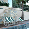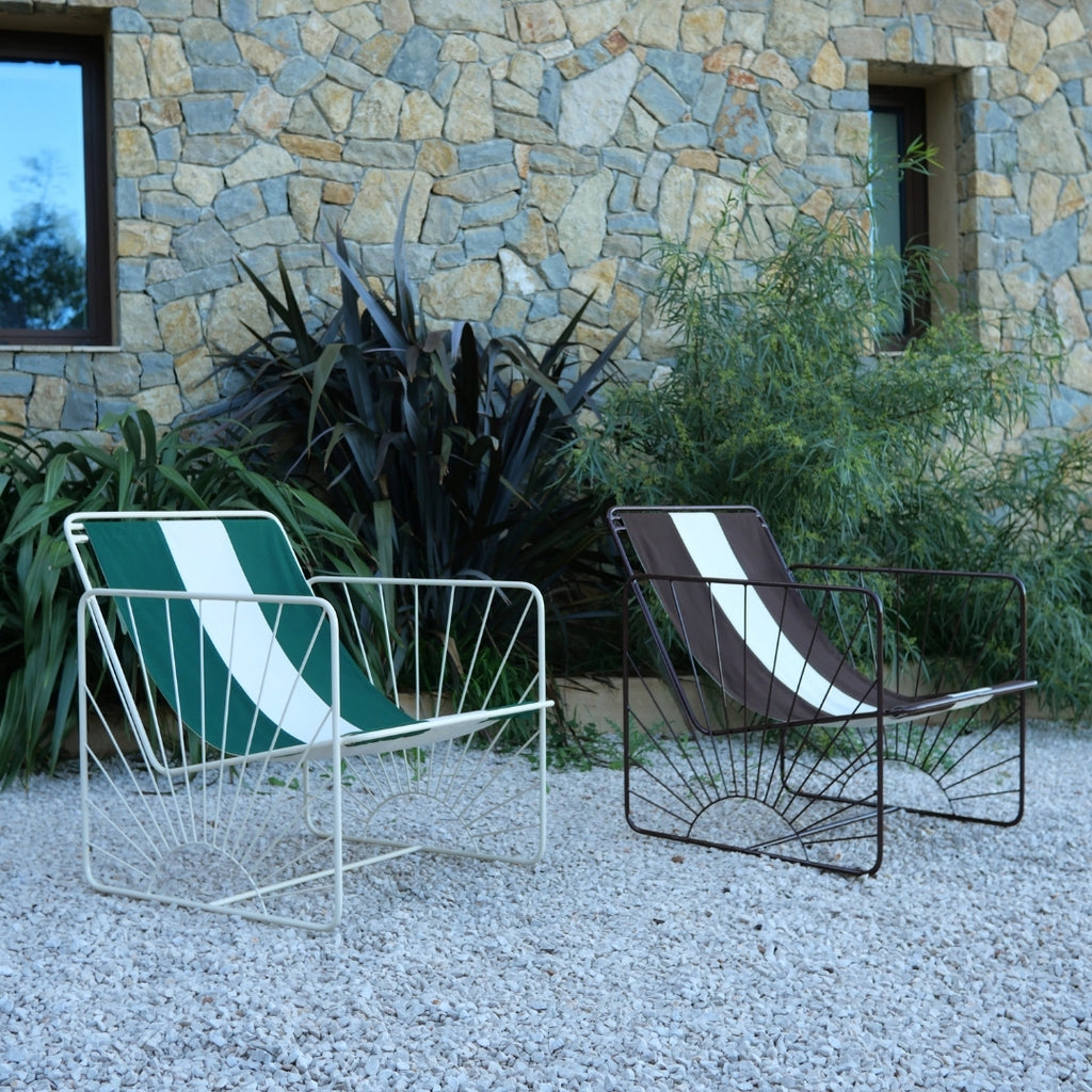 La toile rayée, à la fois solide, déhoussable et déperlante, est doublée d’une toile intérieure dont la teinte fait écho aux rayures. Sa structure en fer, aux lignes cubiques assumées, est proposée en beige glacé ou en marron glacé. Les accoudoirs sont ornés de motif soleil, signatures emblématiques de la collection Eldorado, dont les ombres projetées au sol animent l’espace au fil de la journée.