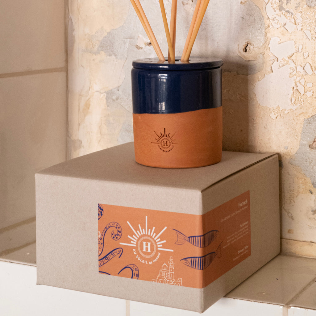 Découvrez Au Soleil by Honoré, une nouvelle gamme de senteurs qui invite à l’évasion : des bougies en cire d’abeille aux notes chaudes de miel de fleurs et de bois, et un diffuseur au sel de mer aux accents frais et minéraux. Une collection simple, solaire, qui capture l'esprit d'un été au bord de mer.