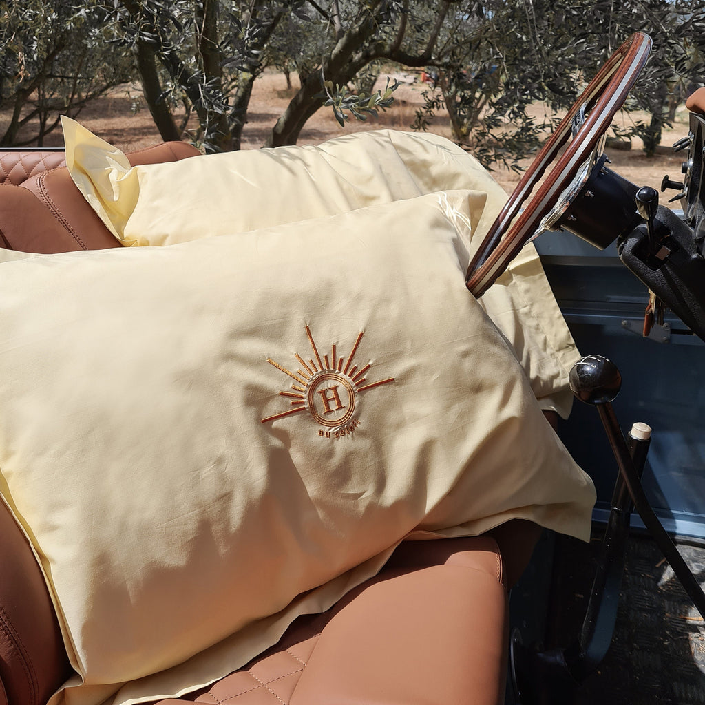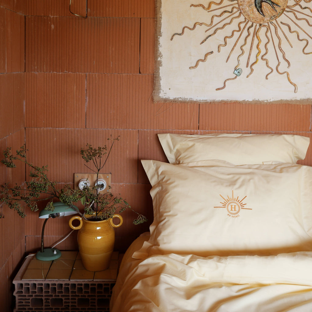 Paire de taies d'oreiller Au Soleil - Jaune paille broderie orange