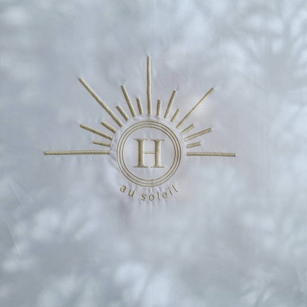 Déclinée en plusieurs coloris, avec des broderies ton sur ton ou contrastées, la parure  Au Soleil s’accorde à votre chambre, votre humeur et vos envies d’évasion.