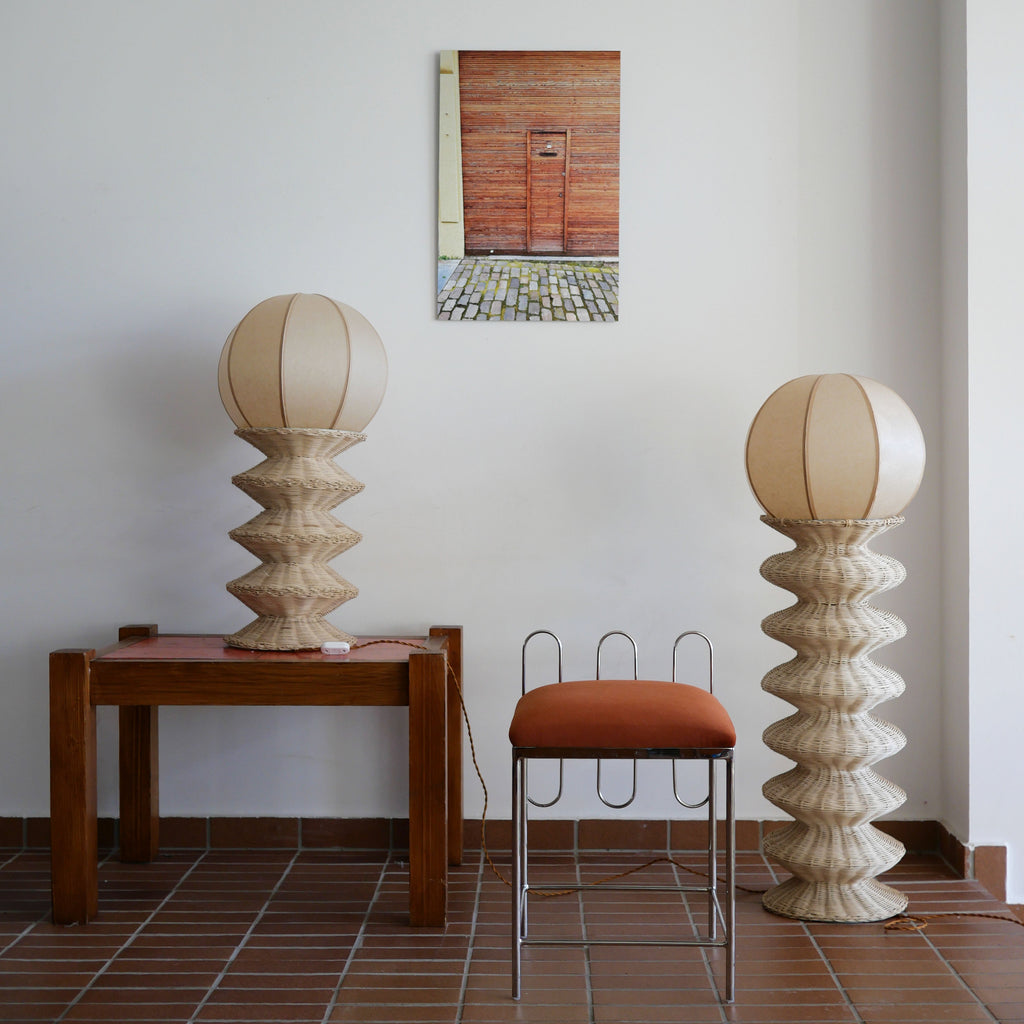 Sa structure en rotin naturel tressé à la main dessine une colonne rythmée et organique. Au sommet, un abat-jour sphérique en parchemin vient adoucir l’ensemble et diffuser une lumière chaude, enveloppante, presque feutrée. Sa forme lui donne un rôle aussi bien décoratif que fonctionnel.