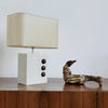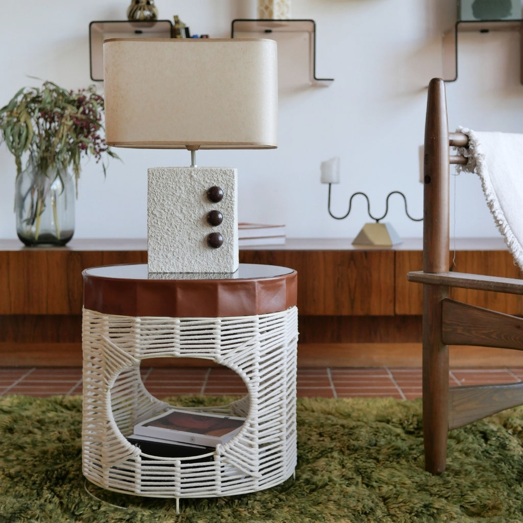 La lampe à poser Magma associe une base sculptée en crépi écru à un abat-jour en parchemin, pour un équilibre subtil entre matière brute et douceur lumineuse.