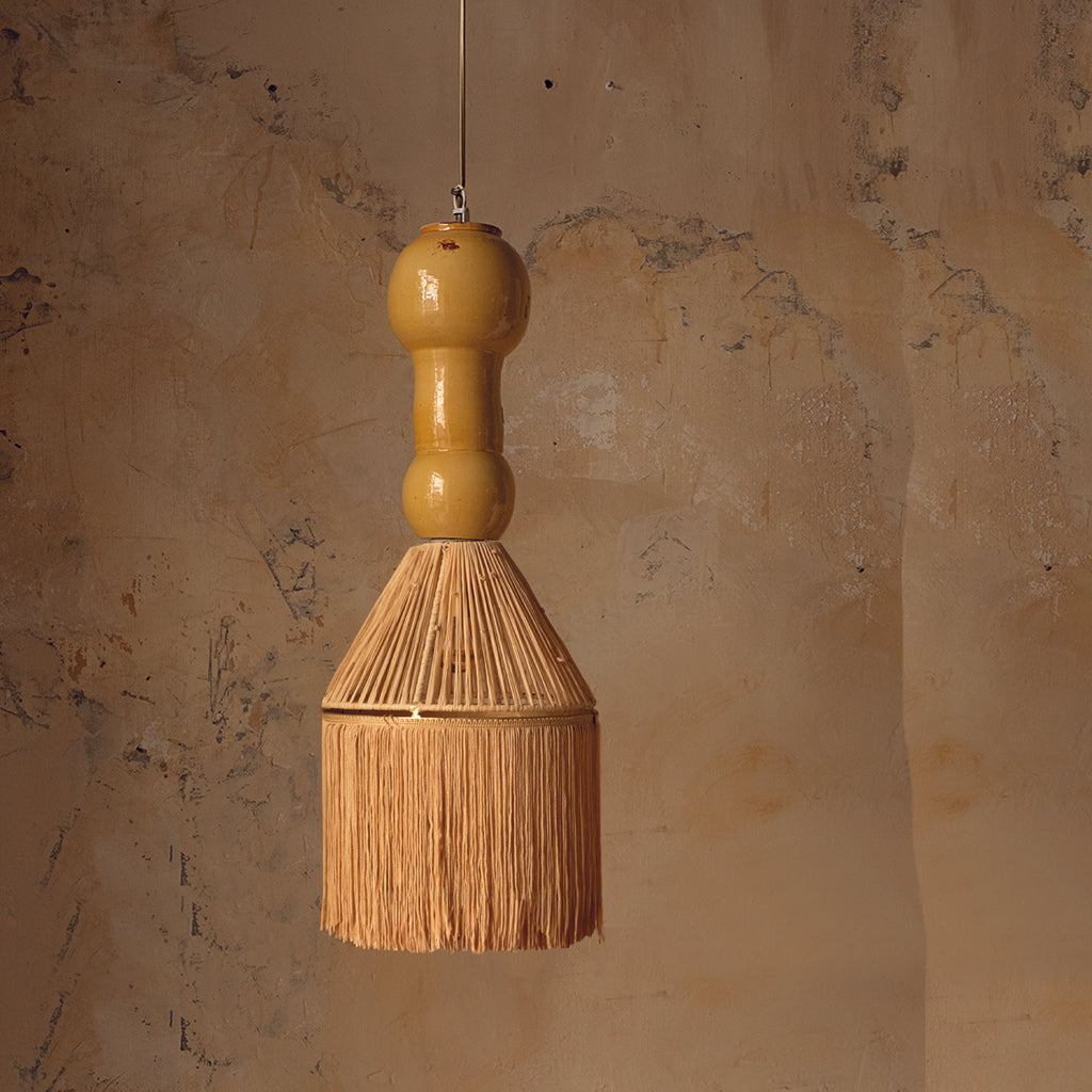 Dernière née de la gamme des luminaires Honoré, Georgette à frange est une adorable suspension en ceramique et en raphia.