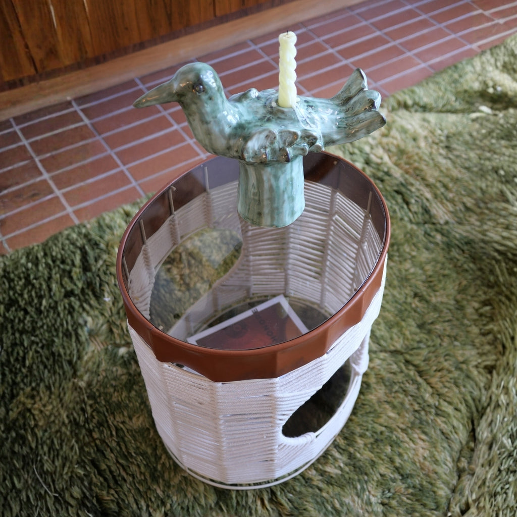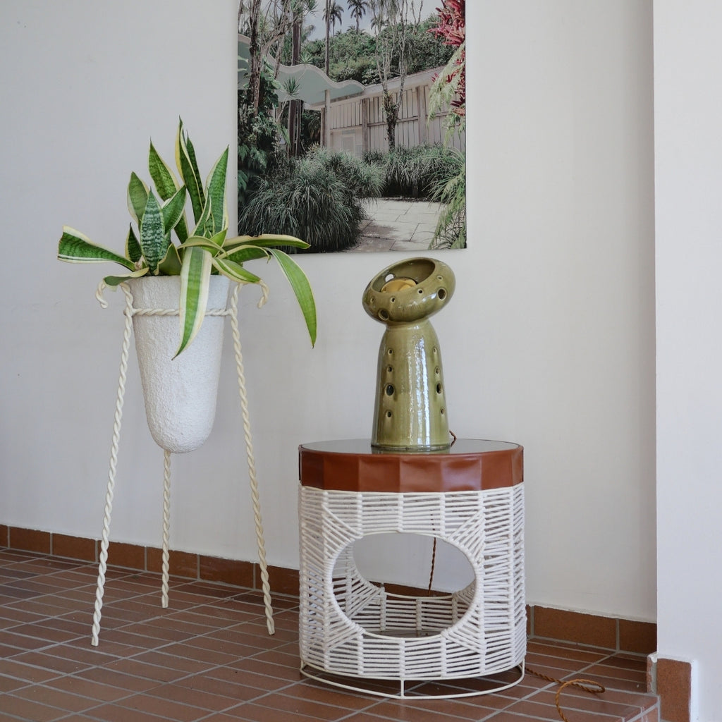 Sa structure associe corde tressée et cuir, travaillés à la main pour dessiner un motif rythmé et graphique. Une ouverture centrale vient alléger l’ensemble et créer un jeu de pleins et de vides. Les deux plateaux en verre fumé, supérieur et inférieur, apportent profondeur et contraste, tout en laissant circuler la lumière.