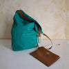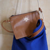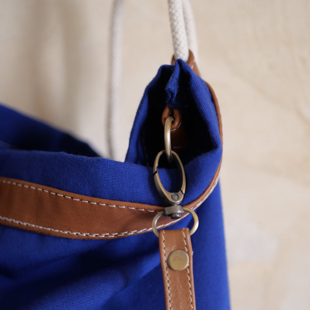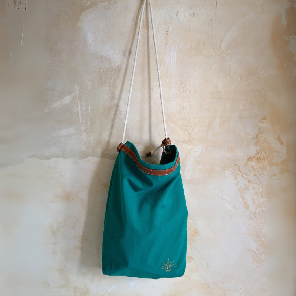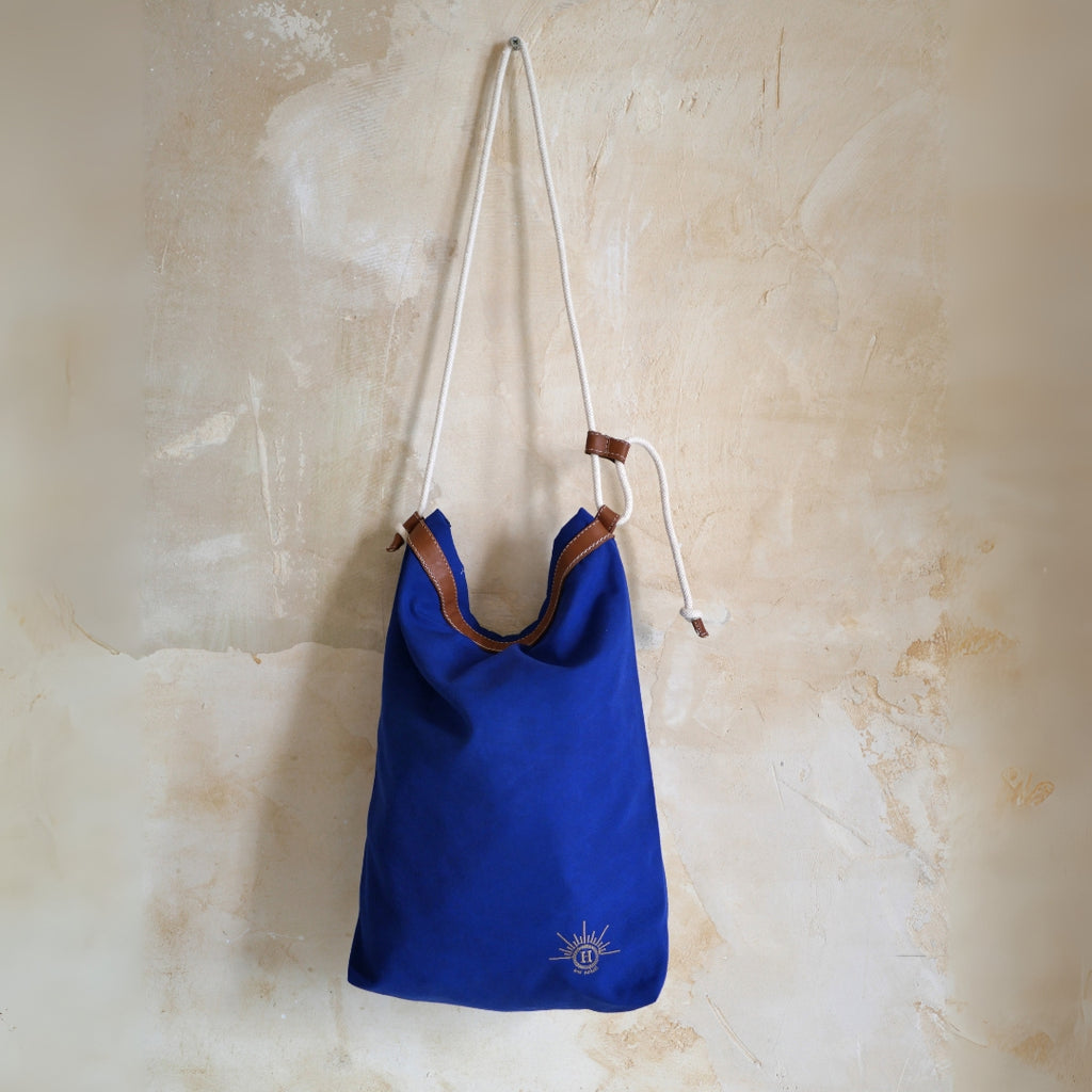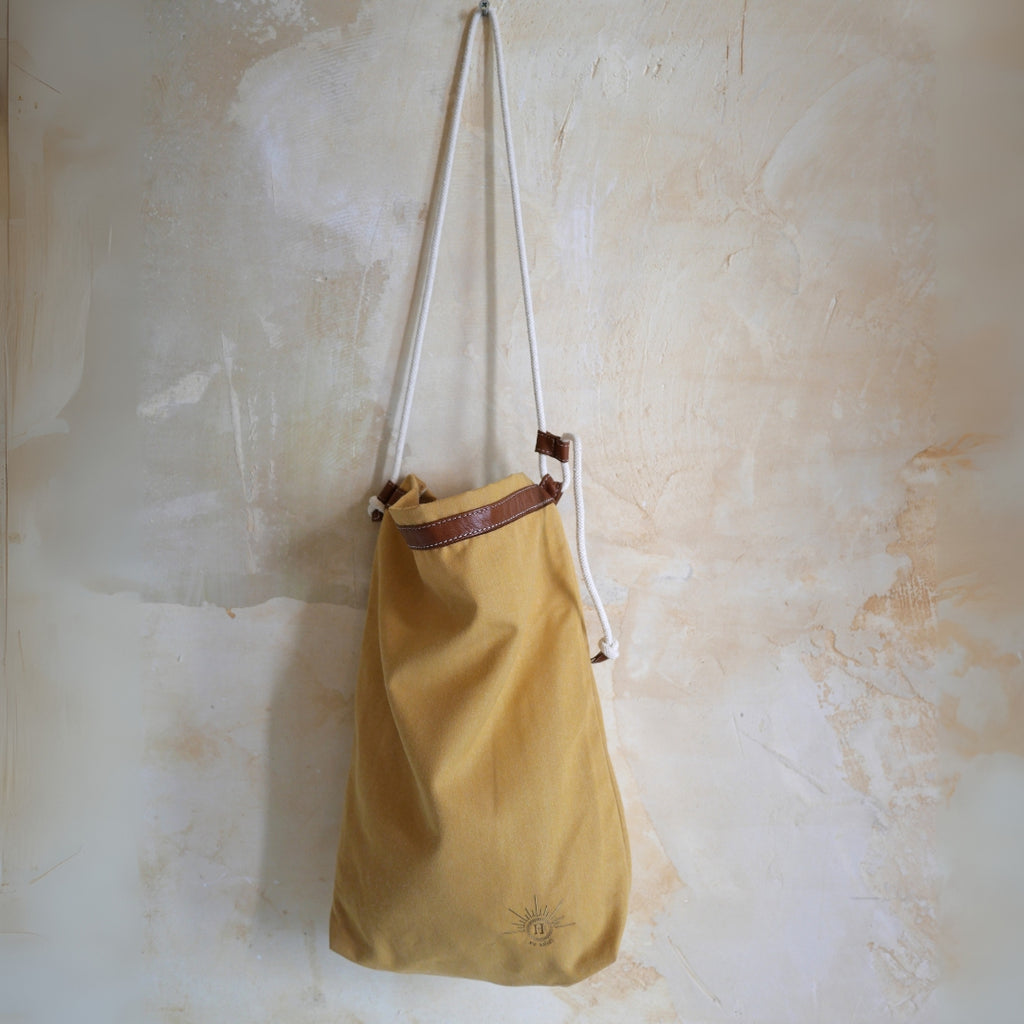 • Sac besace en toile déperlante avec détail cuir, sangle d'épaule en corde ajustable. Pochette en cuir intérieur clipsable logo Au Soleil doré.