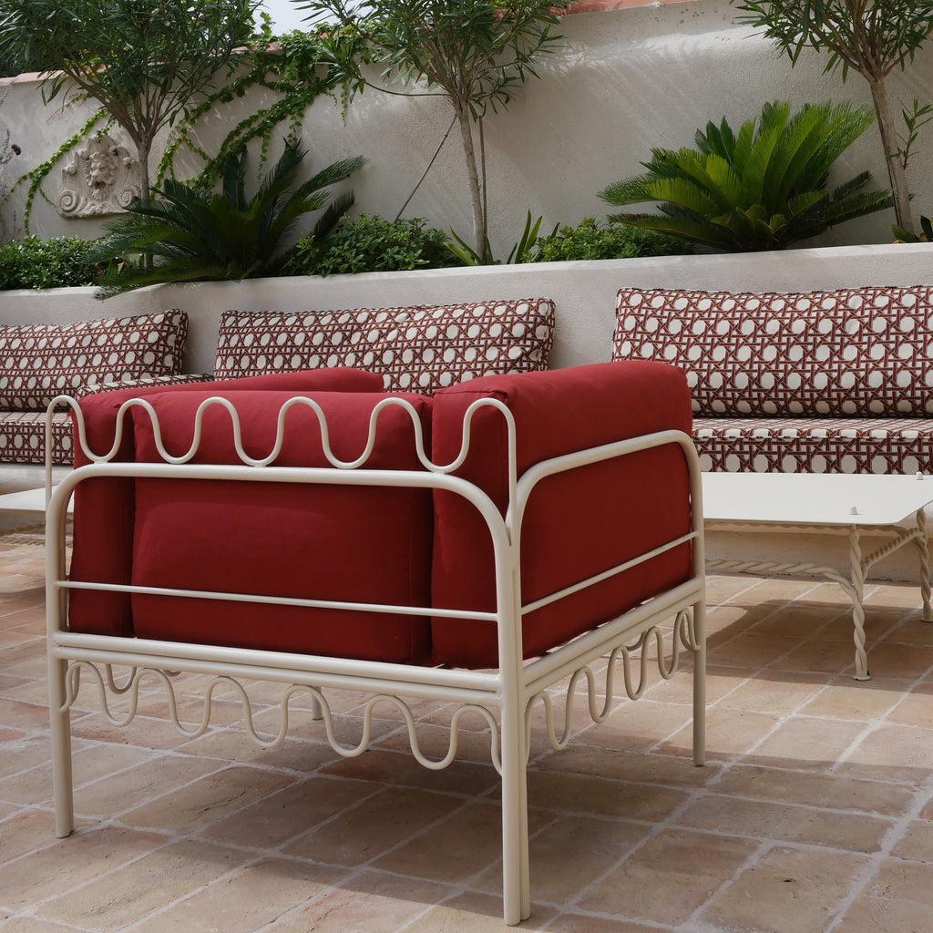 Dolores is the latest of our Honoré armchairs : a generous and cosy armchair with colourful water-repellent fabric and organic lines, not to mention the signature "Dolores" wavy iron lines.