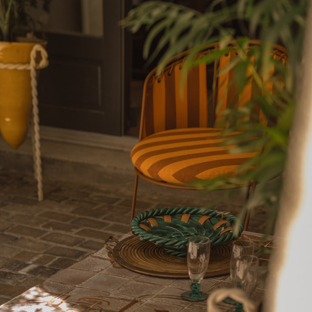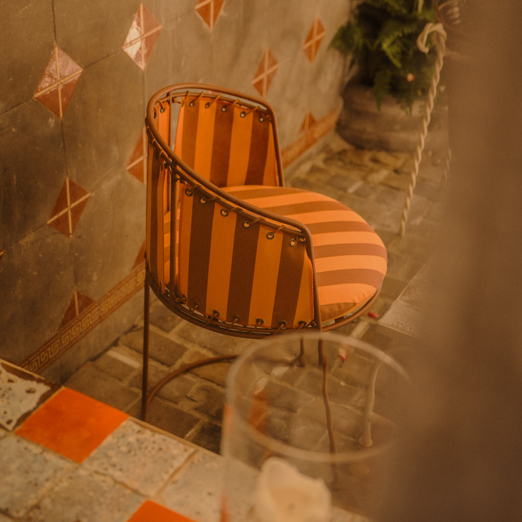 Avec son tissu outdoor rayé, proposant des rayures brick/marron pour une touche terreuse ou blanc/vert pour une fraicheur printanière, la chaise Palmer invite à repenser la scénographie de vos espaces intérieurs et extérieurs.