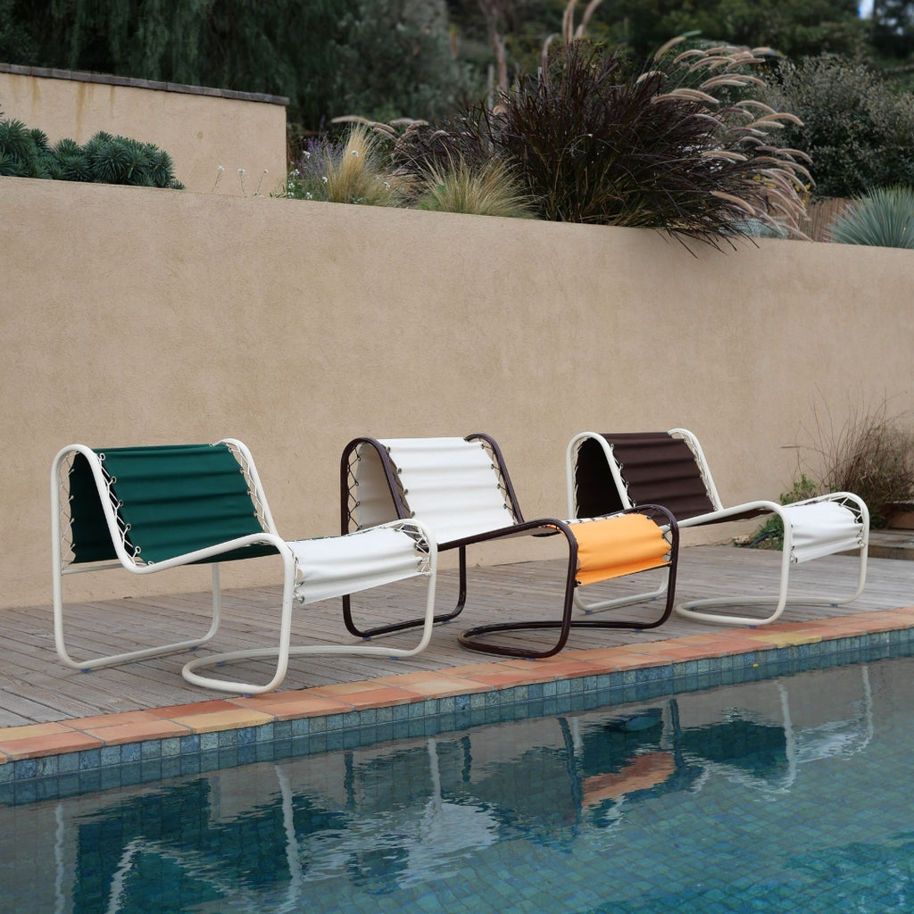 Ses toiles bicolores déperlantes, proposées dans les associations Forest Green / Desert, Tangerine / Desert ou Brownie / Desert, s’accordent à une structure en fer revisitée en beige glacé ou marron glacé. L’ensemble compose un jeu de contrastes équilibré, à la fois graphique et chaleureux.
