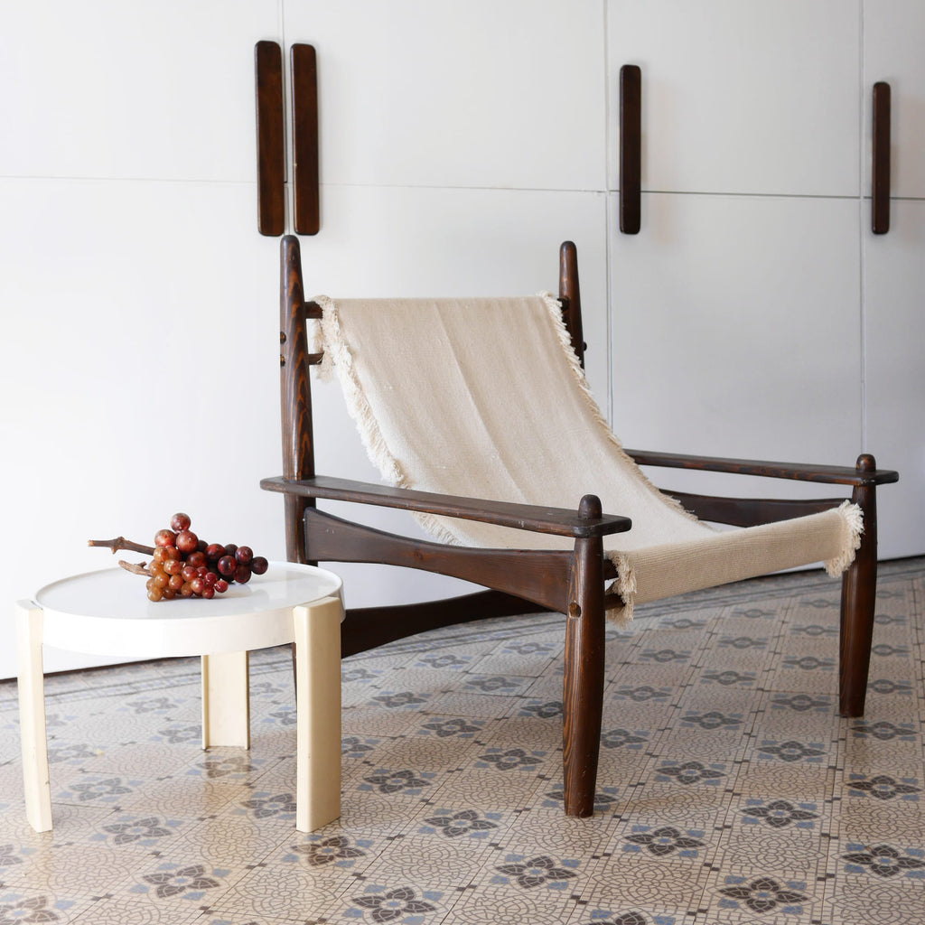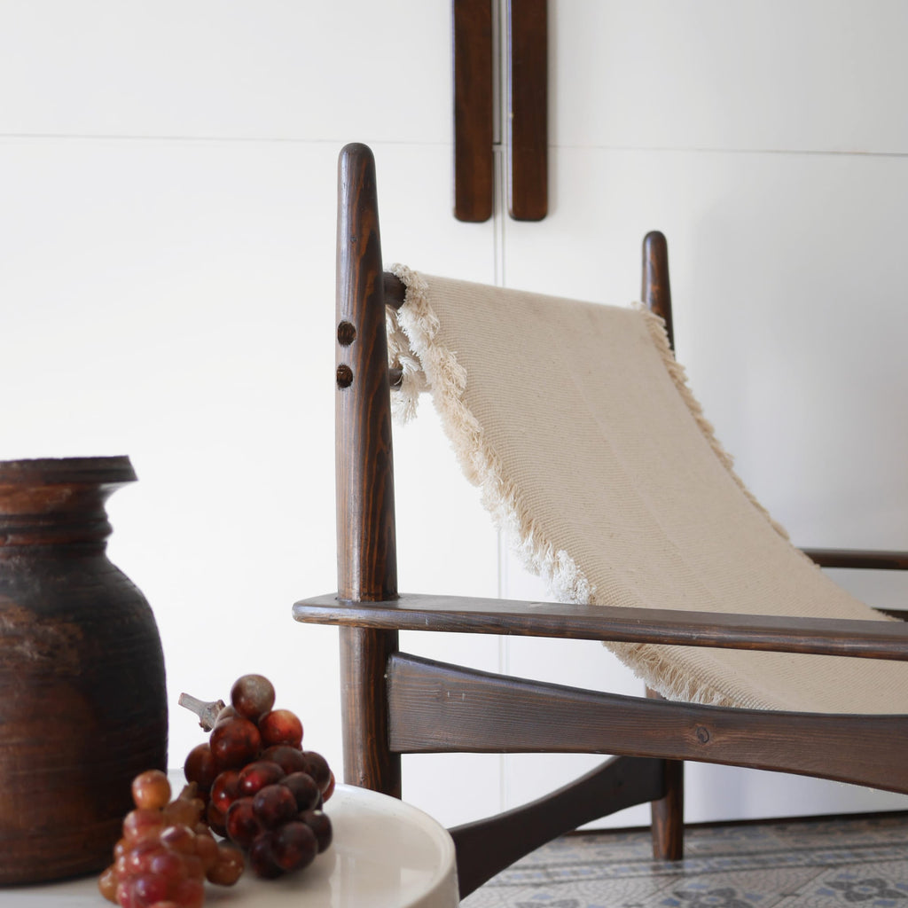 Carlo est une gamme de produits inspirée par le style brésilien des années 60. Le fauteuil Carlo avec sa structure en bois et sa toile en coton écru à franges, se décline avec 3 couleurs de structure : structure en bois teinté foncé, structure en bois peint blanc, structure en bois teinté clair.