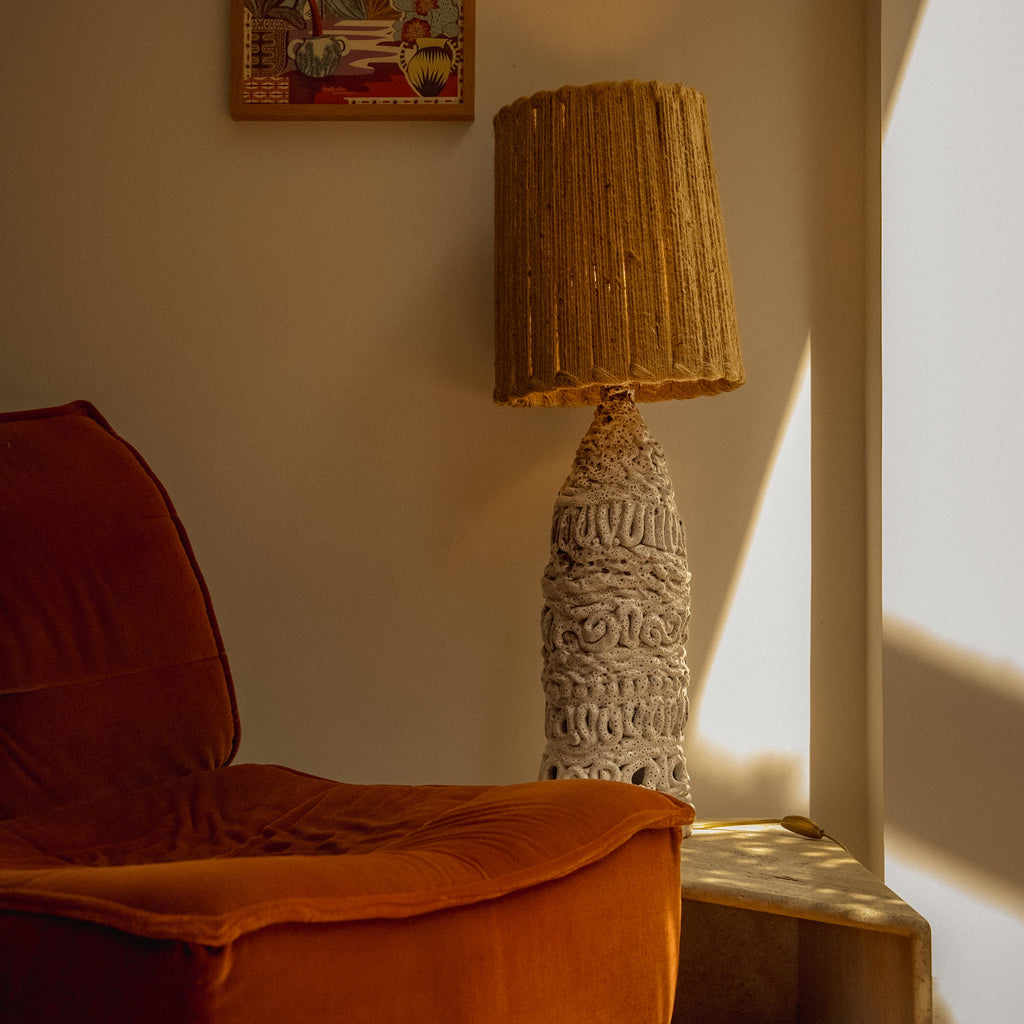 Chaque abat-jour est adapté à la finition du pied : un abat-jour en laine écru pour la lampe en terracotta brute, et un abat-jour en fibre naturelle pour la lampe en céramique blanc texturé.