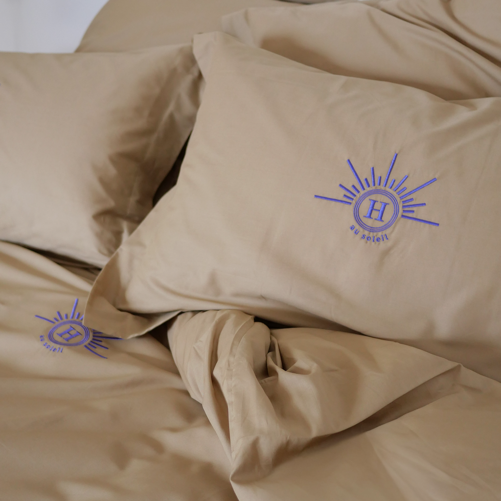 Déclinée en plusieurs coloris, avec des broderies ton sur ton ou contrastées, la parure Au Soleil s’accorde à votre chambre, votre humeur et vos envies d’évasion.